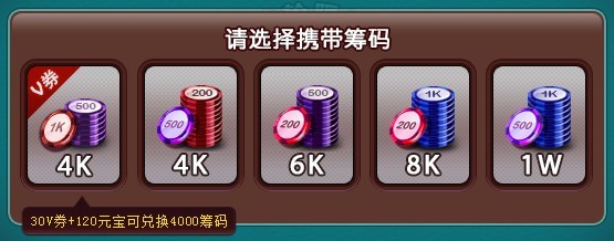 进入德州扑克初级房后,若您满足兑换条件,请点击第一栏“V券兑换”即可进行筹码兑换操作。