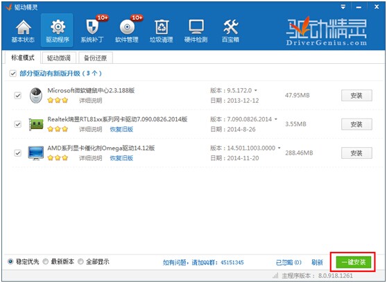 步骤三:点击界面最右下角的“一键安装”按钮,驱动精灵会自动下载并安装,