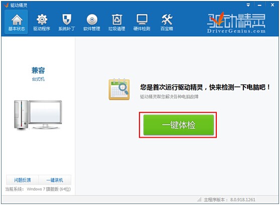 步骤二:驱动精灵安装完成后,运行“驱动精灵”点击一键体检,检查您的驱动是否有异常,