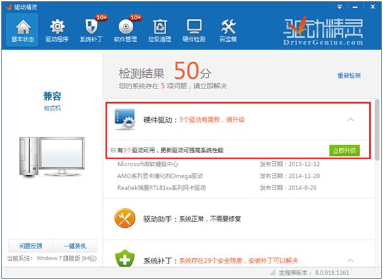 如果提示“您 的设备存在驱动故障,请安装驱动”或者提示“您的设备有部分驱动程序可升级”