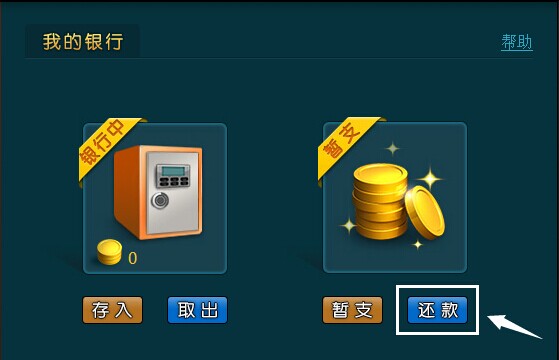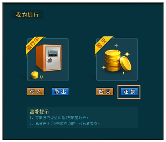 我们也可以在“我的银行”界面点击“还款”直接查看到暂支的波克点数量: