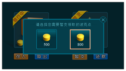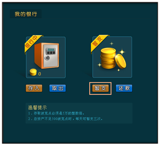 第一步:当您波克点不足500,且帐号内没有波克币的情况下,请在“我的银行”进行暂支;