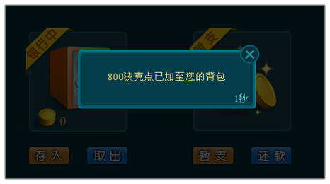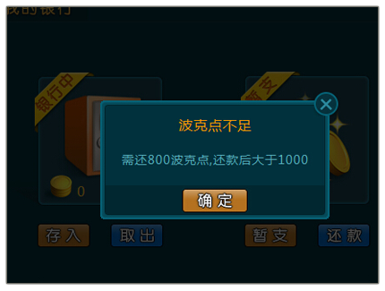 为确保还款后可以正常进行游戏,还款后的帐号内必须剩余1000以上波克点,否则将无法还款。