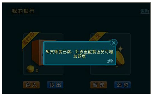 暂支的额度会根据帐号的会员等级而提升,当目前会员等级的暂支额度已满时,您会看到如下提示: