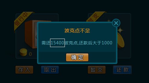 若您还清暂支后帐号内波克点低于1000时,将无法进行还款,提示为“波克点不足”。